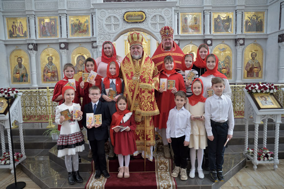 входа в храм правящего архиерея встречали юные певчие детского церковного хора.